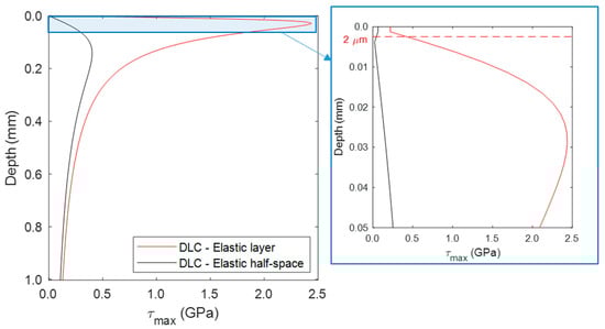 For the section through the centre of the contact, the sub-surface maximum shear stress distribution contains its absolute maximum value. It is clear that for the case of DLC, as an elastic layer, the maximum shear stress is closer to the contact surface than when the layer is assumed to be a semi-infinite substrate. The magnitude of the maximum shear stress is also significantly higher than when it is assumed to be a semi-infinite elastic half-space (nearly five times larger). This is in excess of its yield stress, breaching the Tresca yielding criterion for hard surfaces (as also indicated by Equation (28)). The zoomed inset to Figure 7 shows that the absolute maximum shear stress penetrates well beyond the usual DLC coating thickness of 2 µm. This means that at such a high contact load (3683.6 N), the hard DLC coating does not confine the maximum shear stress within its thickness, which is a requirement to protect the substrate beneath it. This action is envisaged as the raison d’etre of hard coatings. Therefore, the correct contact mechanics predictive approach shows that a high sub-surface maximum shear stress, breaching the confine of the coating thickness, could result in its exfoliation or fracture in practice under these conditions. Therefore, the in-depth predictive approach enables the correct hard coating to be selected for given loading conditions.