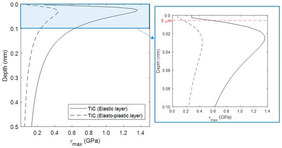 Figure 9 shows that the maximum shear stress has exceeded the Tresca criterion: , where for TiC coatings. However, with the generated stresses exceeding the equivalent stress (Equation (18)), elastoplastic analysis with plastic flow and work-hardening has already occurred. This limits the generated pressures, as shown in Figure 8, as well as the maximum sub-surface shear stress for the case of elastoplastic behaviour (i.e., ). These results indicate compliance with the Tresca criterion. However, the analysis has already indicated a breach of the equivalent stress criterion as well as the maximum shear stress occurring at a depth below the coating layer. The methodology is realistic, holistic, and very practical.