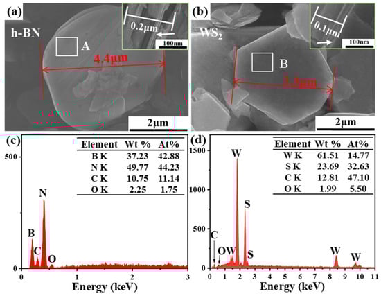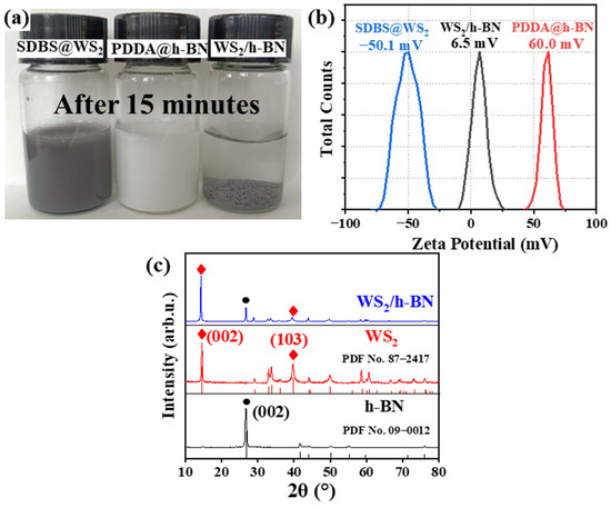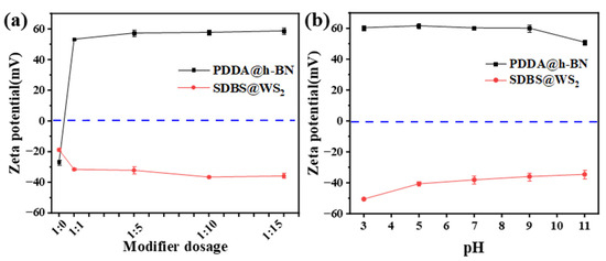 - SDBS and PDDA were used to modify WS2 and h-BN, which the negatively charged SDBS@WS2 and the positively charged PDDA@h-BN were successfully prepared. When the mass ratio of h-BN to PDDA was 1:1 and pH = 3, the zeta potential of PDDA@h-BN was 60.0 mV. Under the same conditions, the zeta potential of SDBS@WS2 was −50.1 mV.
