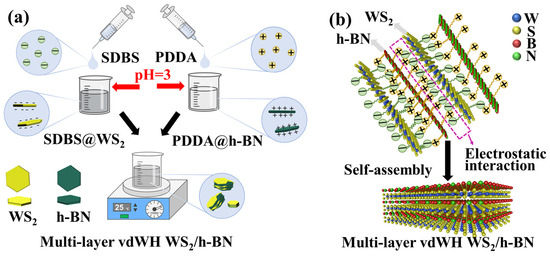 - The multi-layer (4 layers) vdWH WS2/h-BN synthesized by electrostatic interaction method had a sandwich-like structure, in which WS2 and h-BN were stacked alternately along the (002) crystal plane.