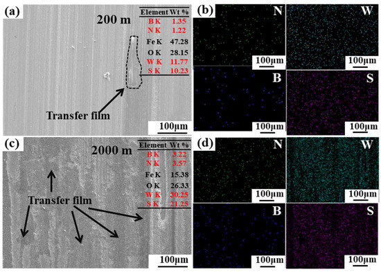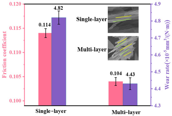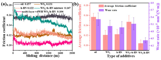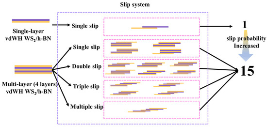 - The multi-layer (4 layers) vdWH WS2/h-BN had better tribological property than single-layer vdWH WS2/h-BN. The friction coefficient (0.104) and wear rate (4.43 × 10−5 mm3/(N·m)) were 8.7% and 8.1% lower than those of single-layer vdWH WS2/h-BN, respectively. This was due to the fact that multi-layer vdWH WS2/h-BN provided more heterogeneous interfaces, which made its slip probability 15 times higher than that of single-layer vdWH WS2/h-BN.