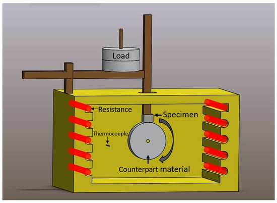 Tribological tests were carried out at both room temperature (RT) and elevated temperature (HT) using two different set-ups. A commercial “ball-on-disc”-type tribometer (Nanovea M/NI/1-E, Madrid, Spain) was used for RT tests and an alumina ball with a diameter of 5 mm was used as a counterpart material for a total sliding distance of 150 m under a 20 N load at a rotating speed of 0.08 m/s (150 rpm). The elevated temperature tests were performed using a home-made tribometer with a “block-on-cylinder” configuration at 450 °C, simulating aluminum extrusion conditions (Figure 1). The counterpart material was selected as the AA6080 alloy with a cylindrical geometry (ϕ 100 mm × 30 mm), and tribological interactions were provided under a 70 N load and a 0.27 m/s (53 rpm) sliding speed for a total sliding distance of 2000 m. The tribological test results were evaluated using (i) diagrams of coefficient of friction (COF) versus sliding distances, (ii) calculation of specific wear rates (W), and (iii) examinations of worn surfaces via SEM and an optical profilometer (Nanovea PS50, Spain). The profilometric measurements provide a sensitive determination of volume losses (mm3) after wear tests. The Archard equation was used for the calculation of specific wear rates (mm3/N·m), where the volume loss is divided by the load (N) and sliding distance (m).