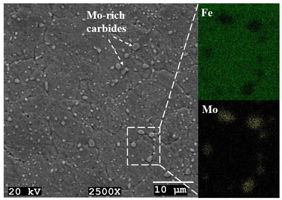 Microstructure of heat-treated steel used as a substrate material and elemental mapping of carbides inside the area marked by the dashed box.