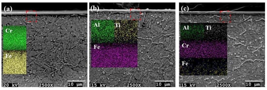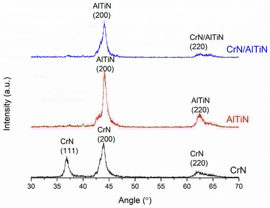 In Figure 4, SEM images of the coatings (CrN, AlTiN and AlTiN/CrN) deposited on the diffusion layer of heat-treated and nitride tool steels are provided. Homogenous and continuous PVD coatings with a ~2 µm thickness are achieved, and the coatings have no defects such as pores, cracks, and delamination. EDS maps acquired at the area indicated by the dashed boxes shown in Figure 4, denote the coatings formed on the surfaces. Due to the low signal from nitrogen, data collection took longer; thus, its map is not included in the figure, and only the metals (Cr, Al and Ti) present in the coatings and iron (Fe) in the matrix are mapped. Multi-EDS analyses revealed the elemental compositions as 0.51 Cr and 0.49 N at.% for the monolayer CrN coating and 0.33 Al, 0.18 Ti, and 0.49 N wt.% for the monolayer AlTiN coating. The Cr:N ratio is calculated as 1.04 and the (Al+Ti):N ratio is calculated as 1.04, indicating that the target metal/nitrogen (Me:N) ratio of ~1 is achieved. In the bilayer coating, chemical compositions are determined similarly for each layer and the calculated Me:N ratios are 1.01 and 1.03 for CrN and AlTiN coatings, respectively. The XRD spectra given in Figure 5 show the presence of ceramic-based coatings like CrN (ICDD 11-0065) and AlTiN (ICDD 71-5864) on the substrates, which is in agreement with previous studies on similar coatings [9,28,29].
