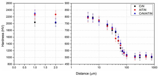 In this section, hardness data are also evaluated for each coating/substrate both on the surface and in the cross-section. Figure 6 shows the hardness profiles at different loads through the cross-sections depending on the matrix structure. In monolayer coatings, the CrN coating exhibits a lower hardness value (2038 ± 115 HV0.01) compared to that of the AlTiN coating (2270 ± 110 HV0.01). The hardness values of AlTiN and CrN layers in the bilayer coating are in the same range as the ones obtained for monolayer coatings. In the diffusion layer, a maximum hardness of 802 ± 32 HV10 is attained just below the coatings down to a 100 µm depth. It is clear that the diffusion layer hardness values have a decreasing tendency due to the decrease in nitrogen content (Figure 6). Multiple hardness measurements below the diffusion layer indicate that the heat-treated tool steel with a tempered martensitic structure has a hardness of 508 ± 22 HV10. It is clear that a functionally graded structure in terms of hardness is attained, since the hardness values keep decreasing from the coating to the substrate material. The obtained surface hardness values are listed in Table 2. As can be seen from the table, the bilayer coating provides a higher surface hardness (2263 ± 125 HV0.01) compared to that of monolayer coatings. In an earlier study [9], similar coatings were deposited on the same substrate tool steel (X45CrMoV5-3-1) without the nitriding process. Compared to the present study, although similar monolayer/bilayer coatings have been obtained, the hardness values are lower than the ones listed in Table 2. Since the nitriding process causes the formation of a diffusion layer which has a high load carrying capacity, the surfaces have a higher resistance to indentation. The presence of a diffusion layer acts as an interface between the coating and the substrate, resulting in improved hardness values, and, as compared to the data reported in [9] for the un-nitrided case, surface hardness increases of 15%, 17% and 16% are achieved for the CrN/substrate, AlTiN/substrate and AlTiN/CrN/substrate, respectively.