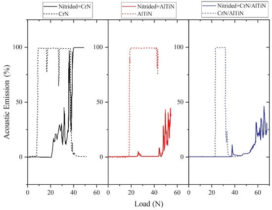 As stated in our previous investigation, X45CrMoV5-3-1 tool steel (DIN 1.2999) with higher Mo and V contents offers superior wear resistance in comparison to other tool steel grades regarded as candidate materials for the fabrication of aluminum extrusion dies, such as X38CrMoV5-3 (DIN 1.2367), X37CrMoV5-1 (DIN 1.2343) and X40CrMoV5-1 (DIN 1.2344) [24]. Concerning X37CrMoV5-1 tool steel, a beneficial effect of nitriding on the high-temperature wear resistance of multilayer-coated substrates has been reported [25]. Moreover, the results of a comparative study have revealed the superior performance of a duplex coating (CrN/AlTiN) deposited on nitrided X37CrMoV5-1 and X38CrMoV5-3 substrates under conditions simulating the aluminum extrusion process [26,27]. However, the literature is scarce regarding the performance of such thin, hard coatings applied after nitriding on X45CrMoV5-3-1 tool steel. In this study, compared to our previously reported study [9], tribological characterization of CAPVD CrN-, AlTiN-, and CrN/AlTiN-coated X45CrMoV5-3-1 steel is carried out in the case of a nitriding process following heat treatment. The findings have revealed how the diffusion layer formed by the nitriding process provides high adhesion and a low wear rate in the coated materials.