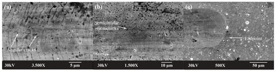 (a) Initial stages of the scratch test in which the angular microcracks form, (b) formation of semicircular microcracks, and (c) the endpoint of the scratch on the surface of heat-treated, nitrided, and CrN-coated steel.