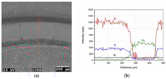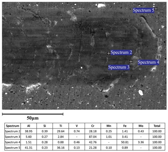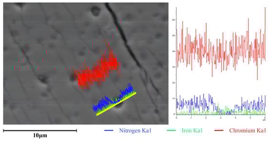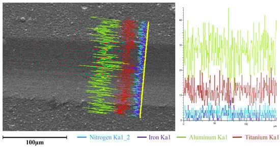 When considering the scratch test track of the heat-treated, nitrided and AlTiN-coated sample, it is observed that the track initially exhibits a low depth and width, corresponding to an intact coating at the early stages of the test. Angular microcracks form on both the upper and lower edges of the scratch when the first acoustic emission peak is monitored. Microcracks are observable at high magnifications. Additionally, both coating chipping and lateral deposition of the coating by the diamond tip are observed at the end of the scratch track. As depicted in Figure 10, there are no significant compositional changes in both the aluminum and titanium inside and outside the scratch path, indicating that the AlTiN coating is only slightly removed by the spherical tip.