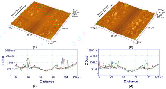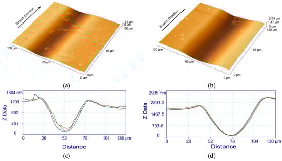 By considering AFM data on the AlTiN-coated specimen, the scratch test track appears to have a low depth and width during the early stages. The depth measured is 0.32 μm, which is lower than the total thickness (2 μm) as seen in the 3D image given in Figure 13a, indicating that the coating remains intact. After the first acoustic emission peak is monitored, the depth increases to 0.64 μm, which is still shallow, and the coating has only been superficially removed by the diamond tip (Figure 13b). The scratch path for the CrN/AlTiN-coated specimen is also examined via AFM, and the findings show that the measured depths are 0.45 μm and 1.1 μm for the initial stage and after the first failure, respectively. The data reflect that the coating has not been entirely removed by the diamond tip at the midpoint of the scratch track.