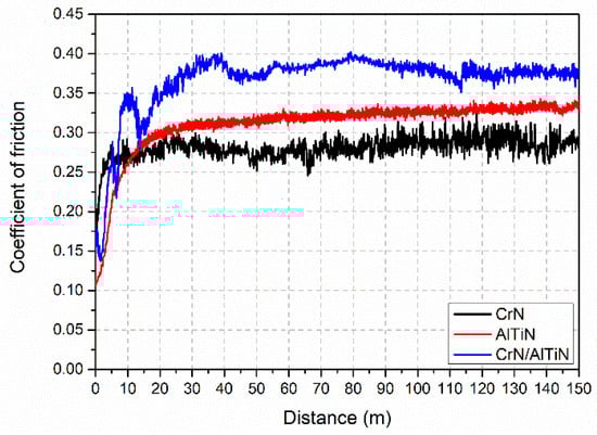 In Figure 14, coefficient of friction (COF) versus sliding distance graphs are given for the coated tool steels after the wear test performed at RT and compared to those of the Al2O3 counterpart material. Considering the range of COF values, all graphs reveal three stages: (i) a running-in stage, (ii) a transition stage and (iii) a steady-state stage. As well known, it is inevitable that the COF increases in the running-in stage due to the deformation of surface roughness and multi-scratching due to the motion of free particles on the surface causing a polishing effect [30,31,32]. The COF values reach a maximum in the transition stage since the surface roughness is decreased and the new surface is subjected to adhesion forces [9,24,27]. In the steady-state stage, friction forces decrease depending on the lack of adhesion of worn particles to the polished surface, the deformation of roughness and the decrease in ploughing, which in turn cause an oscillation in COF values and a steady value is obtained [24,33]. These stages are observed at different sliding distances for the studied surfaces with different surface characteristics. In CrN-coated tool steel, which has the lowest surface hardness, the running-in stage lasts for the first 5 m of the total sliding distance and the COF value reaches up to 0.27. For this material, the transition stage is observed at a 5–10 m distance and the COF value increases to 0.29. The steady-state stage starts after 10 m and the obtained COF value is 0.28, which is higher than the COF value (0.22) obtained for the same coating without the nitriding process and tested under a similar friction condition [9]. As a result of the formation of a diffusion layer between the coating and substrate material due to nitriding, not only a higher surface hardness but also a higher LC value is attained. Depending on the higher surface hardness caused by nitriding, the shear stress increases during contact, which causes higher COF values [24,33,34]. The running-in stage lasts for the first 10 m of the total sliding distance in the AlTiN-coated tool steel, which has a higher surface hardness than the CrN-coated one, and the COF values linearly increase, reaching 0.31 in the transition stage (10–25 m). In the steady-state stage, COF values of 0.31–0.33 were observed due to the increase in shear stress, and this range is higher than the one (0.27) reported for the un-nitrided AlTiN-coated tool steel under the same tribological condition [9]. In the bilayer coating (CrN/AlTiN), the COF values are higher in all stages compared to the single-layer coatings. For this coating, (i) a linear increase is observed in the first 8 m (running-in stage), (ii) a transition stage is observed between 8 and 40 m, with a COF value reaching a maximum of 0.40, and (iii) COF values vary between 0.36 and 0.40 in the steady-state stage. Among all the coated tool steels, the bilayer coating with the highest surface hardness value exhibits a higher COF value at all stages due to the decreased contact area and increased shear stresses. Compared to the un-nitrided case with a 0.38 COF value in steady-state stage [9], this coating has a higher COF value due to the presence of a diffusion layer which increases the surface hardness.
