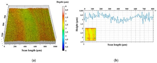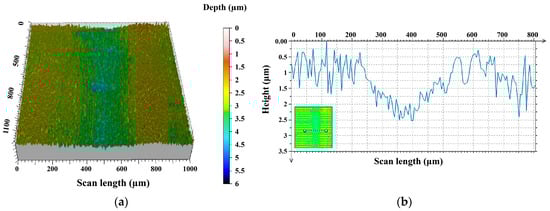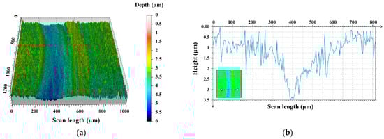 The wear tracks were characterized using a 3D profilometer after the tribological tests at RT, and both the width and depth profiles, which are used for the determination of the volume loss, are displayed. In Figure 15a, the profilometric projection of the worn surface for CrN-coated tool steel is shown, and the regions away from the wear track exhibit the coated surface, which is continuous and homogenous. A line is drawn through the wear track at the deepest point in order to obtain the width and depth 2D profile, which is given in Figure 15b. The width of the wear track is about 280 µm and the track has fine abrasive scratches parallel to the motion of the counterpart material and regions with deep grooves. The track depth (ΔZ) measured after the friction test is decisive in determining whether the coating is removed or not. In CrN-coated tool steel, ΔZ is measured as 2.75 µm and indicates that the coating is partially removed, especially at the center line of the wear track. As can be seen in the projection (Figure 15a), a material pile-up due to the debris removed from the surface by the counterpart is present at a certain height along the lateral direction of the wear track. Although the AlTiN coating with a higher surface hardness than the CrN one reveals similar wear-track characteristics (Figure 16a), the obtained wear track given in Figure 16b is both narrower (~200 µm) and shallower (~1.75 µm) as a function of the lower contact area due to the higher hardness [32,33]. In the bilayer coating, ΔZ is measured as ~1 µm, indicating that the coating is still present on the surface (Figure 17). This result is expected since the highest surface hardness is obtained due to the presence of functionally graded hardness values.