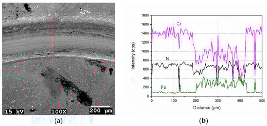 SEM images of the worn surfaces of coated tool steels after the dry friction tests are given in Figure 18, Figure 19 and Figure 20. In general, all wear tracks have a smooth characteristic, and their widths are in agreement with the profilometric measurements. Movement of the counterpart material causes failure of the coatings and detachment occurs; the resulting free wear debris are distributed on the surface and some are accumulated along the wear tracks. As seen in Figure 18a, the track center exhibits abrasive scratches, and adhesive layers are present along the wear track on the CrN-coated surface. The wear debris that are detached from the coating under the applied load act as hard free bodies and cause abrasive scratches at the deepest point of the wear track. It is also inevitable that an adhesive layer structure is formed due to cold welding of debris along the wear track. Two-dimensional body contact changes to three-dimensional body contact due to the presence of wear debris, causing deep scratches along the wear track. The EDS profile taken across the track confirms the performance of the coating during tribological interactions. As seen in Figure 18b, although elements (Cr, N) of the coating appear at the sides of the track, the profile shows that there is a Fe-rich zone at the center of the track, indicating removal of the coating. The presence of coating elements at the sides is evidence that the coating is still present in narrow areas. The profiles of Cr and N indicate that the amounts of these elements are considerably decreased as a result of progressing 3D body contact throughout the wear depth.