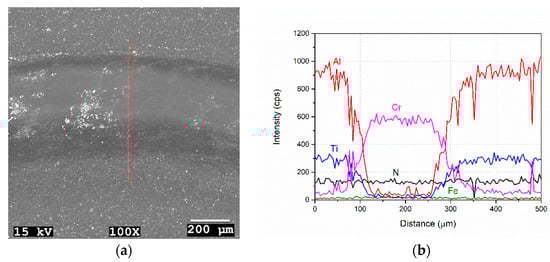 Compared to the CrN coating, less abrasive wear is observed in the wear track of the AlTiN coating (Figure 19a), and the profiles given in Figure 19b reflect that the coating is more persistent. On the other hand, in the wear track of the bilayer coating, rather than abrasive scratches, a polishing effect appears to be dominant, and debris are present as attached particles in the track (Figure 20a). Considering the elemental profiles given in Figure 20b, although the AlTiN coating is removed during the tribological interaction, the CrN coating is still present along the track and no Fe-rich zones (indicating the substrate material) are observed. These findings reveal that the bilayer coating has the highest load carrying capacity compared to the single-layer coatings, and since all wear tests were applied under the same conditions, it is clear that the bilayer coating has the potential to retard wear at longer sliding distances/times. Studies performed under similar test conditions on such a bilayer coating for the un-nitrided case have shown that deep grooves form in the wear track and the coating is completely removed by continuous volume loss at 4 µm below the surface [9]. The results of this study on the bilayer coating emphasize the requirement of nitriding for increasing the load carrying capacity, which is an important factor for improving wear resistance.