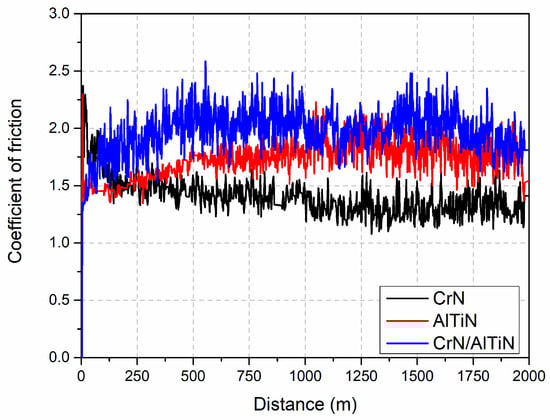 The variation in COF values with the respect to sliding distance is shown in Figure 21 for the high-temperature test performed using a block-on-cylinder setup. The results reveal three stages similar to the RT data for all coatings. The run-in stage lasts for the initial 70 m of the sliding distance. A transition stage is observed in the 70–250 m range and is followed by the steady-state stage for the remaining part of the total sliding distance. The COF values for all coatings are above “1” due to the adhesion of aluminum on the surface. As a result of this, the tribological pair changes to aluminum-coated steel [36]. Such high values were also observed for un-nitrided and similar coated steels in high-temperature tests performed under similar conditions [9]. In addition, addition increases in the case of the interaction between the AlTiN coating and the aluminum-based counterpart material [37]. Although the load carrying capacity is increased by nitriding, the high-temperature wear performance is dominated by the continuous aluminum adhesion on the surface. Under test conditions, fluctuation in the COF values is inevitable due to the oxidation of aluminum and its adherence to the surface followed by the reoxidation and delamination during sliding. Such an effect is reflected especially in the COF values of AlTiN and CrN/AlTiN coatings at their transition stages, and the COF values have a decreasing tendency. In the steady-state stage, the fluctuation in COF values can be attributed to both the formation of an adhered aluminum layer and its failure due to both oxidation and strain hardening under an applied load, which continues in a cycle during the test [4,9,19]. When the steady-state-stage COF values are considered, a difference in the performance of the coatings can be seen. The AlTiN coating has higher COF values compared to the CrN coating, which is the result of aluminum–aluminum interactions [36].