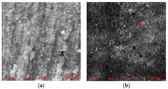 Adhesion of the coatings was assessed by means of scratch testing, specifically a CSM Revetest Scratch Tester (CSEM, Neuchâtel, Switzerland). A diamond tip with a radius of 200 μm and an angle of 120° was utilized at a travel speed of 10 mm/min under a loading rate of 100 N/min to determine the critical load (Lc) at which the first coating failure occurred. The range of progressively increased loads during scratch testing was between 0 and 120 N. Following scratch testing, the specimens were examined stereomicroscopically to study the scratch paths at a low magnification. Subsequently, SEM/EDS (Jeol JSM-5310 Akishima, Tokyo, Japan) analysis was employed to identify the coating failure mode.