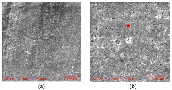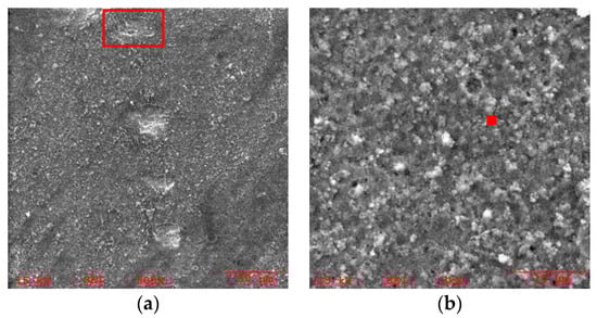 Since the adhered layer can be seen by the naked eye after high-temperature test, the surfaces were dipped into NaOH solution to remove the adhered aluminum layer for SEM investigations to reveal the worn surfaces. The general view of the worn surface of the CrN-coated tool steel tested at HT is shown in Figure 22a and the SEM image reveals that the adhered aluminum layer is still present despite NaOH application. The worn surface also reflects typical droplet delamination, which is a characteristic failure of PVD coatings (Figure 22b). Such a failure occurs via aluminum diffusion to the droplet boundaries of the CrN coating, and the boundaries are weakened by chemical reactions during the tribological interaction [2,18,38]. Although some cracks were observed on the worn surface of the CrN coating that was not nitrided under similar conditions [9], no cracks are present in this study. As well known, significant stress is present between the metal and the ceramic coating at high temperatures as a result of their different thermal expansion coefficients, which causes the cracks in the coating [39,40]. Via nitriding of tool steel, this difference in the thermal expansion coefficients can be reduced; as a result of this, the stress level can be decreased [41]. In addition, nitriding also helps to decrease the plastic deformation ability of the substrate material, and failure of the coating is retarded by the formation of a diffusion layer that provides a higher load carrying capacity [42,43]. EDS studies performed on the worn surfaces confirm our understanding of the functionality of the coatings under tribological interactions. The EDS data (73.62 Cr, 6.59 Al, 9.52 N, 10.27 O wt.%) of the red marked spot in Figure 22b indicate the presence of elements (Cr and N) in the coating at the region where droplet delamination occurs, and the presence of both Al and O elements in the data is related to the adhered aluminum layer. On the worn surface of the AlTiN coating, given in Figure 23a, oxidation of the adhered aluminum layer and its detachment marked in a red frame, followed by re-adherence, can be clearly seen. The dominant failure is droplet delamination (Figure 23b), and the EDS data (44.76 Al, 27.92 Ti, 21.05 N, 6.27 O wt.%) at the red marked spot reveal that the coating is still stable on the surface. Considering the examination of the general worn surface (Figure 24a), similar surface characteristics and failure modes are observed for the CrN/AlTiN coating and a stable bilayer coating exists according to EDS data (43.56 Al, 30.12 Ti, 0.82 Cr, 21.18 N, 4.32 O wt.%) taken at the red marked spot in Figure 24b.