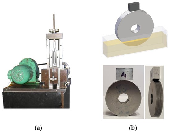 The tests were performed at the University of Kragujevac Faculty of Engineering, in the Center for Tribology, on the TR-95 tribometer. The tribometer with a suitable contact pair is shown in Figure 2. The tribological research was carried out on a tribometer with a geometric characteristic block on disk type, with precisely defined conditions following wear rate (WR) and coefficient of friction (CoF). The material of the contact pair is 90MnCrV8 steel with a hardness of 62–64 HRC and tested composites (A356/10 wt.% SiC/1, 3 and 5 wt.% Gr) for the disc and block, respectively.