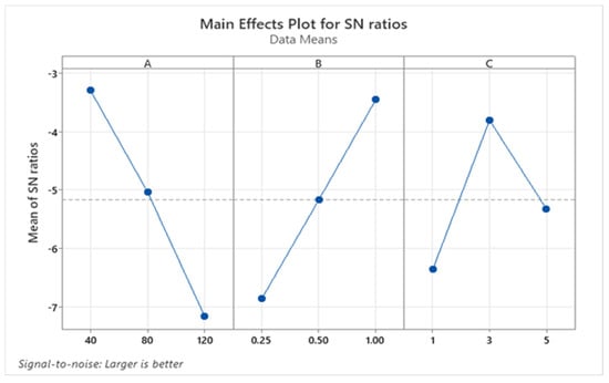 In order to determine the optimal levels of the parameter, the ANOVA analysis was performed at the 95% confidence level. The results of the ANOVA analysis are presented in Table 7, while the results of the S/N ratio are presented in Table 8 as well as in Figure 3.