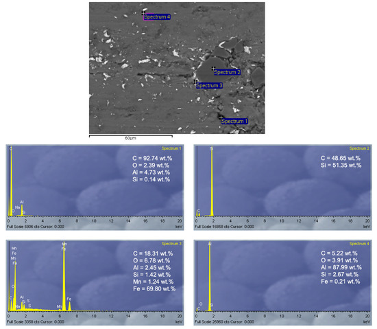 Figure 4 shows the SEM microscopy with EDS analysis for the composite showing optimal characteristics (A356/10SiC/3Gr). When adding SiC reinforcement, the tribological behavior of the tested composite materials changes. SEM images and EDS analysis show the presence of trace amounts of iron and its oxides. These particles are light-colored in the images, so their position and direction of movement on the wear track can be easily followed (spectrum 3, Figure 4). The EDS analysis of worn traces also shows the presence of graphite (spectrum 1, Figure 4); graphite particles are mostly found in the vicinity of SiC particles (spectrum 2, Figure 4). It is interesting that these particles are grouped mostly on the side of the SiC particles, which is in the direction of movement. The appearance of iron on the contact surface of the composite material occurs due to the transfer of material from the metal counterbody (disc). The main wear mechanisms of these composites are adhesion wear and delamination, which are explained in detail in the paper [41,42].