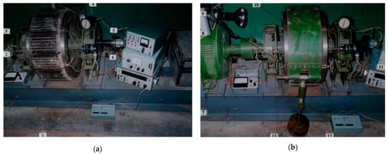 General view of the workbench with a band brake with an open (a) and a closed brake band (b): 1—frame beams; 2, 3, 4—friction pads with external and internal working surfaces, respectively; 5—brake pulley, 6—thermocouple terminals; 7—electric motor for driving the brake pulley; 8—brake pulley shaft with elastic coupling; 9—outputs of the microammeter; 10—brake band; 11—tachometer; 12—load node; 13—shaft bearing supports.