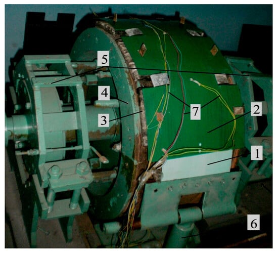 General view of the friction units of the belt brake with sensors: 1—the main brake belt; 2—additional brake tape; 3—friction pads; 4—brake pulley; 5—bearing supports of the brake pulley; 6—load node; 7—connecting wires of sensors.