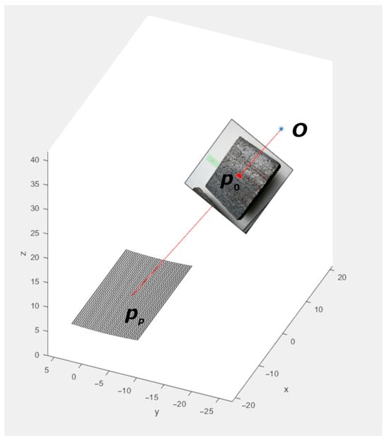 The part of a cylinder occupied by the regular image grid is determined by the brake pad surface dimensions (120 × 230 mm) and the radius of its circular curvature of 0.7 m. To recover the image of the brake pad, every pixel of the rectangular grid on the surface of the cylinder is assigned with the value of the original image . To perform this assignment, the mapping from to should be established. The coordinates are determined by the intersection of the line with the camera image plane . Line passes through the point of the rectangular grid on the surface of the cylinder and optical center of the camera and is determined by the equation , where . Image plane is determined by the equation , where is a point of intersection of image plane with the main optical axis of the camera, is the normal vector to the image plane, the direction of which coincides with the main optical axis, and is the scalar product. The intersection point is determined by the parameter :