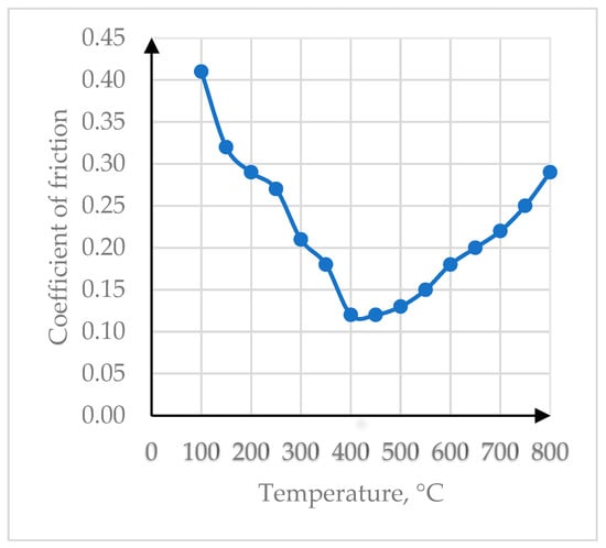The analysis of the graphical dependence presented in Figure 6 shows that with increasing temperature in the friction zone, the value of the friction coefficient initially decreases and reaches a minimum value of 0.12 at temperatures of 400–470 °C. Under such temperature conditions, the decomposition products of the bond (phenol–formaldehyde resin) act as a solid lubricant. A further increase in the temperature in the friction zone leads to a certain increase in the value of the coefficient of friction, but it no longer reaches a higher value than at the beginning of the test at a temperature of 100 °C. During friction, phenol–formaldehyde resin decomposes under the influence of elevated temperature, providing the necessary positive gradient of mechanical properties in a tribological pair with alloy steel. FK-24A material exhibits high frictional properties during difficult operating conditions of the belt brake of the drilling drawwork. Similar dependences for the change in the friction coefficient on temperature during the operation of retinax in a pair with 40ChN steel were presented in Interstate Standard GOST 10851–94 [105], where the minimum value of the friction coefficient was also observed in the temperature range from 400 to 500 °C.