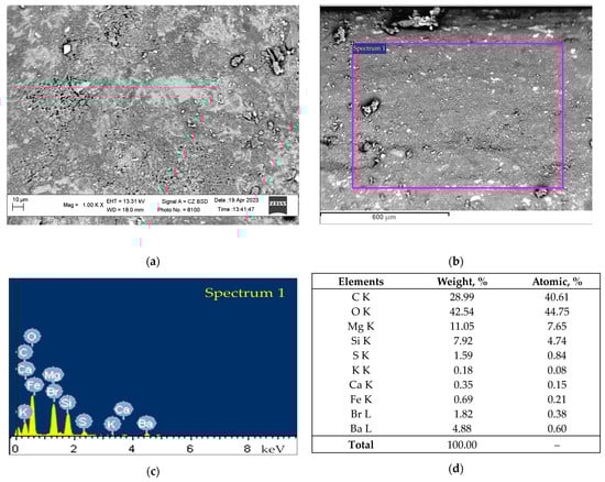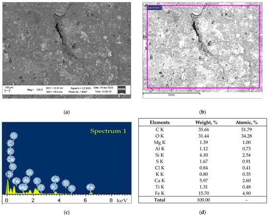 The friction surface of the worn steel brake pulleys was also not additionally processed. After the wear tests were completed, SEM and EDXS tests were performed on 10 × 10 mm cross-sectional samples of the worn surface of the brake friction pads, which were cut with a mechanical saw. Microscopic studies were conducted at the center for collective use of scientific instruments “Center for Electron Microscopy and X-ray Microanalysis” of the Karpenko Physico-mechanical Institute of the National Academy of Sciences of Ukraine, Lviv. The examined surface of the worn brake pad was not additionally processed, but only delicately cleaned of contamination with a soft brush made of natural wool, washed with ethyl alcohol and dried in the air. Before conducting electron microscopic studies, a monolayer of gold was applied to the friction surface of the samples to increase electrical conductivity using a magnetron type JFC-1600 (JEOL, Tokyo, Japan). We used a ZEISS EVO 40XVP (ZEISS Group, Jena, Germany) scanning electron microscope with a micro-X-ray spectral analysis system and an INCA ENERGY 350 (Oxford Instruments, Abingdon, UK) energy-dispersive X-ray spectrometer.