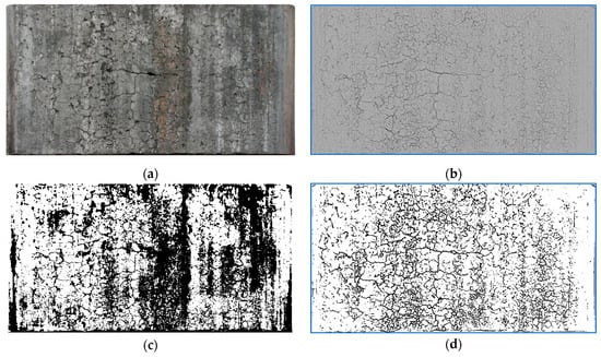 To obtain a final binary image with detected cracks, the values of should be properly thresholded. In practice, the constant threshold value results in significant error in the final binary picture of detected cracks. This is explained by the different values of produced by cracks in images of different brake pads, which thus require different threshold values for correct segmentation. Therefore, it is necessary to use techniques with adaptive threshold values. For this purpose, the Otsu method [113] was used.