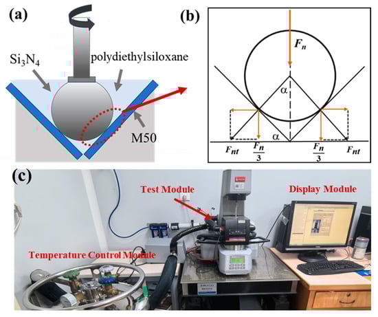 The friction and wear experiments reported herein were performed using an Anton Paar three-plate ball cryogenic test module (Model MCR301, Anton Paar, Graz, Austria). The testing configuration employed Si3N4 ceramic balls with a diameter of 12.7 mm and M50 steel disks measuring 14.9 × 5.9 × 3.1 mm. Figure 1 depicts the operational layout, wherein the three M50 disks are angled at 45° to the rotation axis and affixed in place using screws. Prior to testing, both the ceramic balls and steel disks underwent ultrasonic cleaning in a sequential bath of petroleum ether, acetone, and anhydrous ethanol for a duration of 15 min each to remove any residual contaminants. Subsequent to the cleaning process, the components were dried using nitrogen gas to eliminate moisture and ensure surface purity.