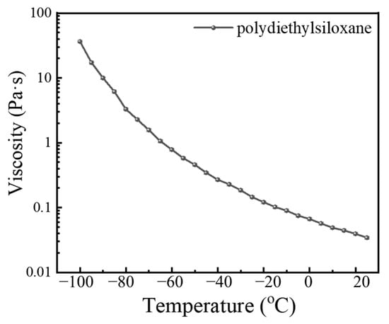 PDES is a derivative of polysiloxane characterized by a low glass transition temperature (Tg), contributing to its unique physical properties. Notably, PDES exhibits significant flexibility at low temperatures and stability at high temperatures. The Tg of PDES typically ranges from −144 °C to −139 °C [,,,]. This exceptionally low Tg can be attributed to the flexibility of the silicon–oxygen backbone and the presence of larger ethyl side groups, which increase the free volume and consequently diminish intermolecular forces. Below the Tg, PDES behaves as a hard, brittle solid with very high viscosity, rendering it nearly non-flowing. Above the Tg, however, PDES transitions to a rubbery state, with a marked decrease in viscosity. This decrease is facilitated by increased thermal motion, which enhances the mobility of the molecular chains, thereby reducing internal friction and significantly lowering viscosity with rising temperature.