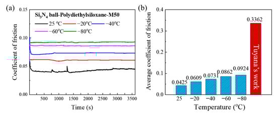 (a) Coefficient of friction and (b) average coefficient of friction at different temperatures [].