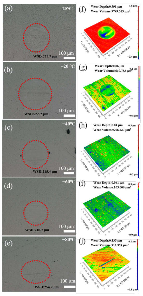 The evaluation of the wear rate for the Si3N4 ceramic balls and M50 steel disks was facilitated through the utilization of 3D white light interferometry, which provided detailed images to measure the wear depth and volume on the surface of the M50 steel disks at varying temperatures, as illustrated in Figure 4f–j. The results reveal a distinct pattern in which both wear volume and depth initially decrease as the temperature drops, followed by a subsequent increase. Notably, the wear volumes recorded at 25 °C and −60 °C were 9749.513 μm³ and 105.006 μm³, respectively, indicating a significant reduction of nearly tenfold. This observation underscores the effectiveness of the low-temperature friction interface in substantially reducing material wear. Nevertheless, a notable increase in wear volume was observed at −80 °C, a phenomenon primarily ascribed to the disintegration of the polydiethylsiloxane lubricant film at such low temperatures, which in turn led to an increased wear volume. In a similar trend, the depth of the wear marks decreased with falling temperatures, from 0.391 mm at 25 °C to 0.04 mm at −60 °C, only to rise again to 0.135 mm at −80 °C.