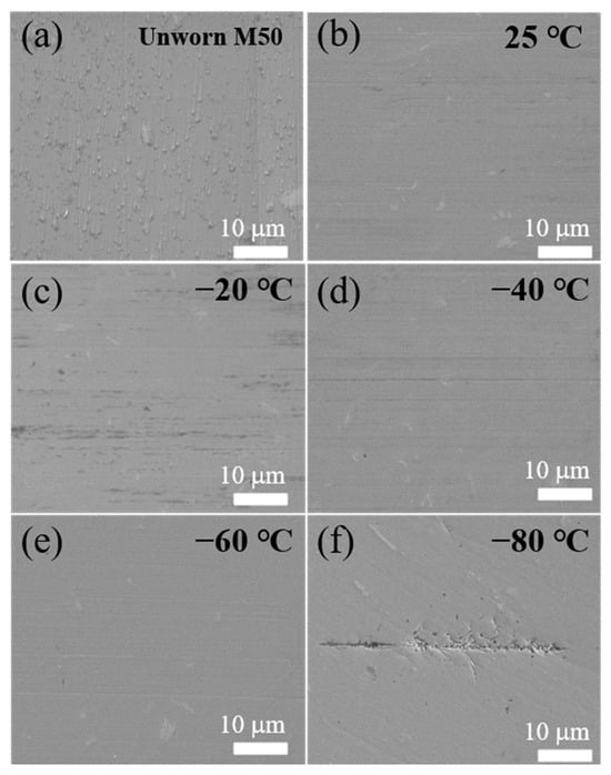 SEM images of M50 disk after friction tests at different temperatures: (a) unworn M50 disk surface; (b) 25 °C; (c) −20 °C; (d) −40 °C; (e) −60 °C; (f) −80 °C.