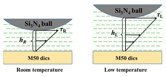 Figure 6 elucidates the wear mechanism of polydiethylsiloxane at low temperatures, showcasing its exemplary lubrication performance. This performance is chiefly ascribed to polydiethylsiloxane’s inherent properties and an augmentation in the thickness of the lubricant film. As the Si3N4 ceramic ball undergoes rotation, polydiethylsiloxane generates dynamic pressure at the friction interface, ensuring the maintenance of an optimal oil film thickness. With a reduction in test temperatures, polydiethylsiloxane’s viscosity increases, consequently diminishing its mobility. Nonetheless, this heightened viscosity is instrumental in creating a more substantial dynamic pressure between the Si3N4 ceramic ball and the M50 steel disk, promoting the development of a thicker oil film and thereby elevating the lubrication system’s efficiency. Additionally, the mechanical properties of M50 steel at varying temperatures significantly impact the wear behavior observed during testing. At an ambient temperature, M50 steel exhibits strong mechanical resilience, potentially leading to the accumulation of abrasive particles on the wear surface and subsequent furrow formation. Conversely, a decrease in temperature renders M50 steel more brittle, compromising the protective capacity of the polydiethylsiloxane film and ultimately precipitating lubrication failure. This intricate relationship between the viscoelastic properties of polydiethylsiloxane and the evolving mechanical characteristics of M50 steel underlines the complex dynamics governing the wear mechanism, illustrating the nuanced interaction between lubricant functionality and material behavior in low-temperature contexts.