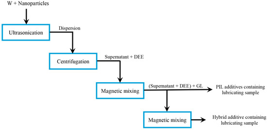 First, 15 mL samples containing 0.25 wt. % of NPs in water were dispersed using ultrasonication for 90 min in the Bandelin SONOREX TM RK 514 H ultrasonic cleaner operating in the following parameters: power—880 W, temperature—≤45 °C. Further, the samples were subjected to 10 min of centrifugation in the Thermo ScientificTM Multifuge X3R (Thermo Fisher) centrifuge to remove undispersed agglomerates. The centrifugation parameters: rotation speed—4700 rpm, temperature—20 °C. The obtained supernatant was used to formulate lubricating samples. The principal preparation scheme is presented in Figure 1, while the detailed explanation of the preparation was described in our previous study [30].