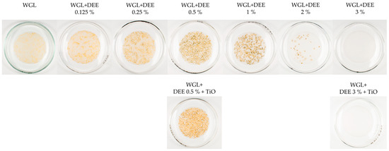 The lubricating samples containing hybrid additives were prepared by combining NPs and DEE. In this case, titanium oxide supernatant was loaded with an appropriate amount of DEE and stirred on a magnetic stirrer at 400 rpm for 30 min, maintaining 40 °C. After dissolving DEE, the glycerol was incorporated into the solution, and the mixture was stirred using the procedure described above. There was a single concentration of NPs, while protic ionic liquid had two concentrations, which were chosen based on the tribological results obtained when DEE was used alone. The samples contained 0.5% and 3% of DEE and the same amount of NPs. The visual characteristics of lubricating samples containing hybrid additives are presented in Figure 2. The samples involving NPs have a white shade from titanium oxide. The titanium oxide supernatant was opaque white.