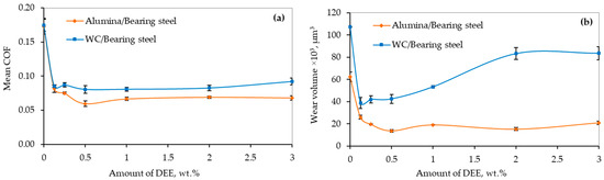 According to our previous studies and reports from other scholars, protic ionic liquids provide superior lubricity to aqueous lubricants [6,12,39]. Therefore, this study investigated the performance of ionic liquid alone before its combination with NPs. The mean coefficient of friction and wear volume observed when glycerol aqueous solution was loaded with protic ionic liquid are presented in Figure 4. The lubrication with additive-free base fluid produced high COF for both friction pairs. The COF was significantly reduced with the introduction of DEE (Figure 4a). In the case of a tungsten carbide ball, the COF was decreased to 0.08 and showed no significant variation with an increased concentration of DEE. On the other hand, the lubrication of the alumina ball containing friction pair underwent more improvement when a higher concentration of DEE was applied. Lubrication of the Alumina/Bearing steel friction pair showed the lowest COF of 0.06 using the lubricating sample containing 0.5% DEE.