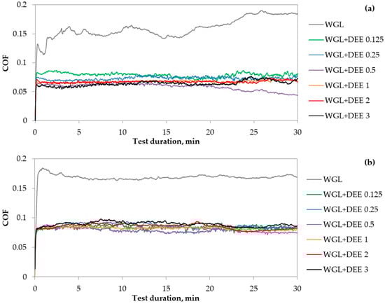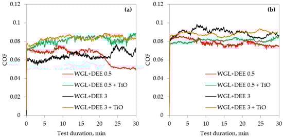 The application of hybrid additives provided base fluid with different lubricity features. This section will compare the lubricity of hybrid additive-loaded WGL with that described above, where 0.5 and 3% of DEE additive-containing WGL was investigated. The comparison of COF variation when DEE was used alone and together with NPs is presented in Figure 8. Although the mean COF increased when hybrid additives were used to lubricate the Alumina/Bering steel friction pair, the COF became more stable. The stabilizing effect can also be discerned in the case of the WC/Bearing steel friction pair lubrication. However, this friction pair’s difference between mean COF values is negligible. Therefore, it can be stated that the application of hybrid additives stabilizes the friction process in both friction pairs.
