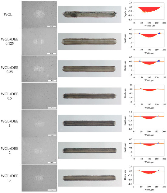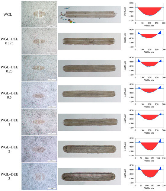 The effect of DEE concentration on the appearance of wear marks after tribo-test of the WC/Bearing steel friction pair. From left to right, the sequence includes the wear scar on the ball, the wear trace on the plate, and the cross-sectional profile of the trace.