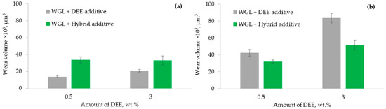 The wear volume of (a) Alumina/Bearing steel and (b) WC/Bearing steel friction pairs after lubrication with DEE and hybrid additives.