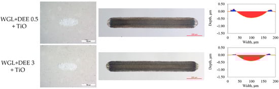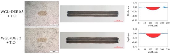 The wear traces on the plate exhibited minimal polishing when DEE was introduced at any studied concentration. Slightly more abrasion occurred when the WC ball slid against the bearing steel plate. Figure 6 and Figure 7 also provide corresponding cross-sectional profiles of the wear traces. The lubrication with WGL resulted in high abrasion on the plate surface when the Alumina ball was used. In contrast, the worn surface observed after lubricating the WC/Bearing steel friction pair is relatively smooth. The difference in worn surface appearance correlates with COF variation, where the WC ball having friction pair shows more stable COF (Figure 5).