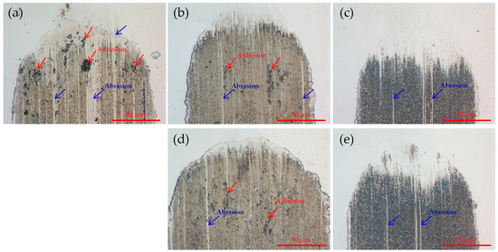 For the WC/Bearing steel friction pair, the most pronounced characteristics appeared at the ends of the wear traces, specifically where the reciprocating ball alters its sliding direction. These areas experienced particularly severe lubrication conditions. Utilizing a base fluid without additives led to adhesion between the interacting surfaces, as depicted in Figure 12a. The adhesion was also evident in the whole wear trace, as seen in Figure 7. The adhered particles caused three-body abrasion on the relatively soft plate surface. Introducing protic ionic liquid reduced the adhesion and abrasion (Figure 12b,d). However, minor adhesion marks can still be found at the ends of the wear trace. The appearance of wear trace changed significantly when protic ionic liquid was used together with nanoparticles (Figure 12c,e). By using hybrid additives, the adhesion was eliminated, and abrasion was reduced. It could be that NPs acted as rolling elements, thus preventing direct contact between interacting surfaces and stabilizing friction [42,43]. However, Figure 12c,e show that tribo-film was removed from the very end of the wear trace. Maybe at a low speed, titanium oxide NPs have a polishing effect. Some papers reported the sintering as an action mechanism of titanium oxide NPs [42].