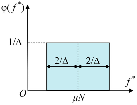 where represents the density function of the yield force. The density function of the yield force in the classical Iwan model is uniformly distributed, as shown in Figure 9. When , the tangential force is expressed as follows: