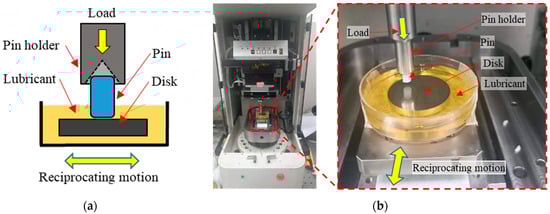 For the self-alignment of the flat pin surface with the flat disc surface, a conical-shaped pin holder was utilized to hold and apply pressure to the top side of the pin, as depicted in Figure 2a. To ensure the repeatability of friction measurements, a minimum of three measurements were conducted for each sample, and the average values were subsequently reported.