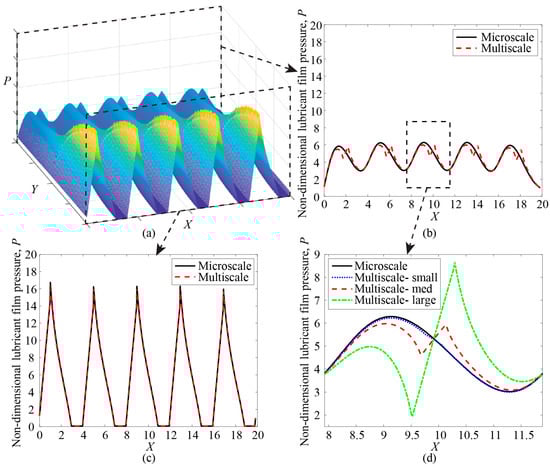 The edge contour in Figure 3b passes between microscale texture features and through the center of the interstitial texture features. From this figure, we observe that the solution with only microscale texture features shows a repeating increase and decrease in the lubricant film pressure, corresponding to the locations of the microscale texture features in the X-direction. The combined multiscale texture solution shows an additional slight decrease followed by a slight increase in pressure due to the extra diverging and converging channels from the interstitial texture features. Figure 3d shows a magnified view of the lubricant film pressure contour for the centermost texture features at the edge of the array for the microscale texture features (black solid line) and three different sizes of interstitial texture features in a multiscale array (blue, red, and green lines). Increasing the size of the interstitial texture features leads to a greater disruption of the lubricant film pressure in this region of the array, but the deviations are similar in both the positive and negative directions. The interstitial texture features do not cause cavitation at the conditions simulated here, and the net influence of the interstitial texture features on the lubricant film pressure is small compared to the microscale texture features. Both texturing conditions have the same load-carrying capacity, W = 4.935, but the combined multiscale texture features resulted in a slightly thicker lubricant film (δ = 0.0488) compared to the solely microscale texture features (δ = 0.0484). This is due to the interstitial texture features increasing the volume of lubricant between the bearing surfaces and acting as additional micro-hydrodynamic bearings.