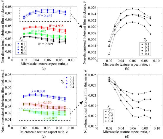 To determine the effect of changing the microscale texture features on a multiscale textured surface, we perform simulations with varied texture feature design parameters (Sp and ε), keeping the interstitial texture features constant (Spi = 0.01, εi = 0.02). In each simulation, we calculate the non-dimensional lubricant film thickness (i.e., non-dimensional bearing spacing, δ) required to generate sufficient lubricant film pressure to carry the applied load. Figure 4 plots this film thickness as a function of the microscale texture aspect ratio. Figure 4a shows different values of the load-carrying capacity, W, in different colors and Figure 4b shows a magnified view of the simulation results with W = 2.467. Figure 4c shows different values of the flow factor, λ, in different colors and Figure 4d shows a magnified view of the simulation results with λ = 0.075. Increasing the load-carrying capacity and decreasing the flow factor reduce the lubricant film thickness because the bearing surfaces are compressed closer together, or because the lubricant viscosity or the bearing surface velocity has decreased, which reduces the hydrodynamic pressure generation. We also see that a texture density of Sp = 0.2 results in the maximum lubricant film thickness for each simulated condition. There is an optimal texture aspect ratio that maximizes the lubricant film thickness, however, the value of the optimal texture aspect ratio changes with the bearing operating conditions. Specifically, the optimal texture aspect ratio increases with operating conditions that increase the lubricant film thickness (i.e., increasing λ and decreasing W), similar to the results reported in [].
