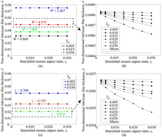 To determine the effect of changing the interstitial texture features on a multiscale textured surface, we perform simulations with varied interstitial texture feature design parameters (Spi and εi), keeping the microscale texture features constant (Sp = 0.02, ε = 0.05). Figure 5 shows the non-dimensional lubricant film thickness as a function of the interstitial texture aspect ratio. Figure 5a includes results for λ = 0.300 and different values of the load-carrying capacity (W = 2.467 in blue, W = 4.935 in red, W = 7.402 in green, and W = 9.869 in black), and Figure 5b shows a zoomed-in view of the simulations with W = 4.935. A dotted line shows the lubricant film thickness for a bearing surface with only microscale texture features under the same bearing operating conditions. Figure 5c plots the non-dimensional lubricant film thickness as a function of the interstitial texture aspect ratio for different values of the flow factor (λ = 0.300 in blue, λ = 0.150 in red, and λ = 0.075 in green). Figure 5d shows a magnified view of the results with λ = 0.075. Again, we observe that the lubricant film thickness decreases as the load-carrying capacity increases and as the flow factor decreases, because the increased loads push the bearing surfaces closer together and the lubricant viscosity or bearing surface velocity are decreased. At the conditions simulated here, the interstitial texture features have a slight effect on the overall lubricant film thickness. However, from the zoomed-in view in Figure 5b, we see that the lubricant film thickness increases as the interstitial texture density and aspect ratio decrease. We also observe that the interstitial texture features increase the lubricant film thickness compared to the microtextured surface at these simulation conditions (λ = 0.300 and W = 4935).