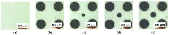 Figure 6 shows optical images of workpiece surfaces after textures were created on a smooth Ti6Al4V surface using a solid-state laser. The untextured surface, designated by D000d00 in Figure 6a, serves as the primary reference. Images of textured surfaces show accurate round-shaped texture details. Figure 6b depicts a surface with just microscale textures, D100d00, which serves as a secondary reference measuring approximately 100 μm in diameter. Figure 6c–e exhibit the fabrication of interstitial texture features with diameters of 30, 45, and 60 μm, respectively, among the constant size micro texture feature.