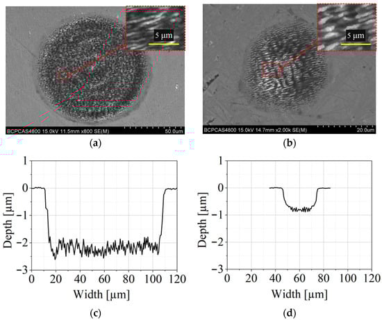 Figure 7a,b show the SEM images of microscale texture with 100 μm diameter and a sample for interstitial texture features with 30 µm diameter, respectively. The cross-sectional surface texture profile of microscale textures in Figure 7c and the interstitial textures in Figure 7d illustrate the surface roughness inside and around the surface texture features. The average microscale texture feature depth is 2.2 μm, while the interstitial texture feature depth measures 0.73 μm. Negligible material buildup is observed around the texture edge, indicating that the ultra-fast laser pulse direct texturing method is a feasible approach for producing microscale and nano-scale texture features on metallic surfaces, and avoid the need for repolishing after laser texturing.